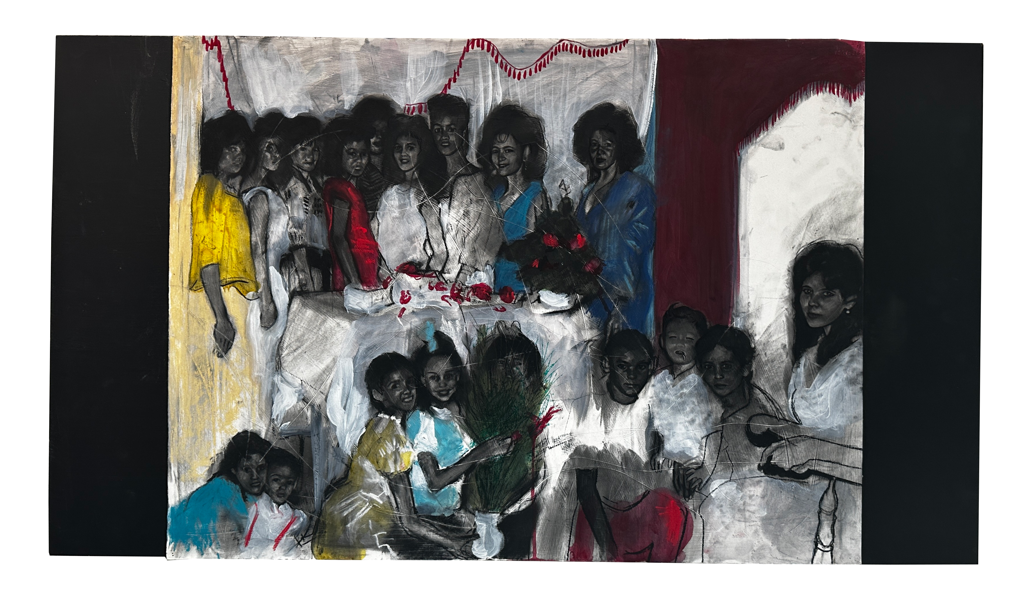 Charcoal, acrylic, watercolor, and white charcoal on paper mounted on MDF